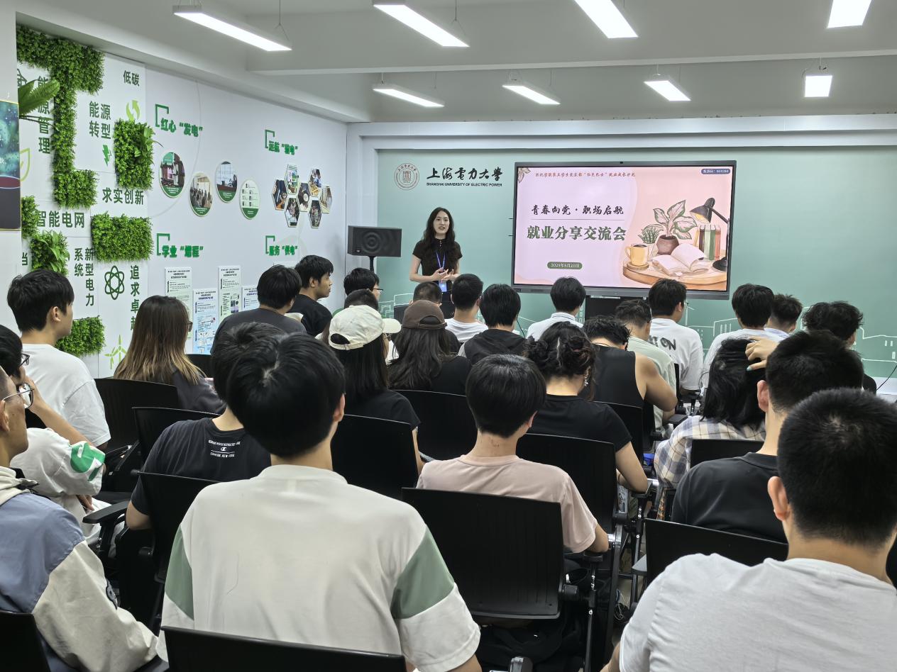 2025年5月21日,“青春向党,职业启航”就业交流会作为“红色巴士”的第三站在“一站式”学生社区服务中心开展,特别邀请入职华能、华电、申能等能源央企的五位预备党员组成“职场先锋队”,为60余名2022级学生做经验分享。