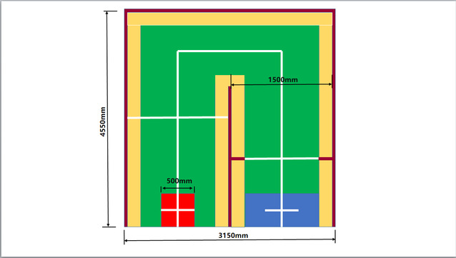 4、机器人从启动区出发,机器人应在绿色草原上前进,进入沙地则被警告, 持续在沙地超过5s,将被视为失控,机器人此时的位置为最远位置。若果机器人触碰围栏,则视为失控,应从起点处重新启动;
