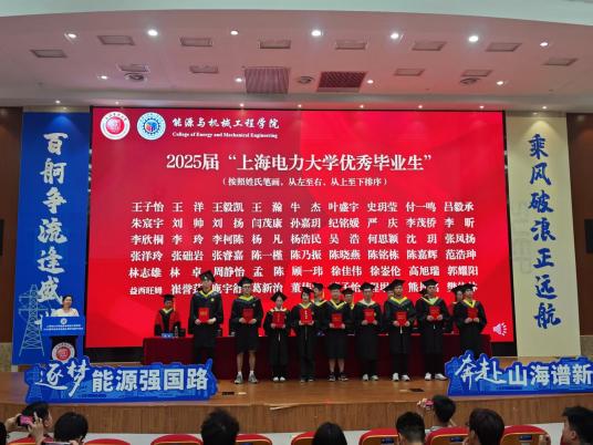 潘卫国和陈乃超先后宣读了学院《2025届“上海市普通高等学校优秀毕业生”名单》和《2025届“上海电力大学优秀毕业生”名单》,18名市优秀毕业生和54名校优秀毕业生锐意进取,成为能机学子的榜样力量。主席台领导为优秀毕业生代表颁发了证书。