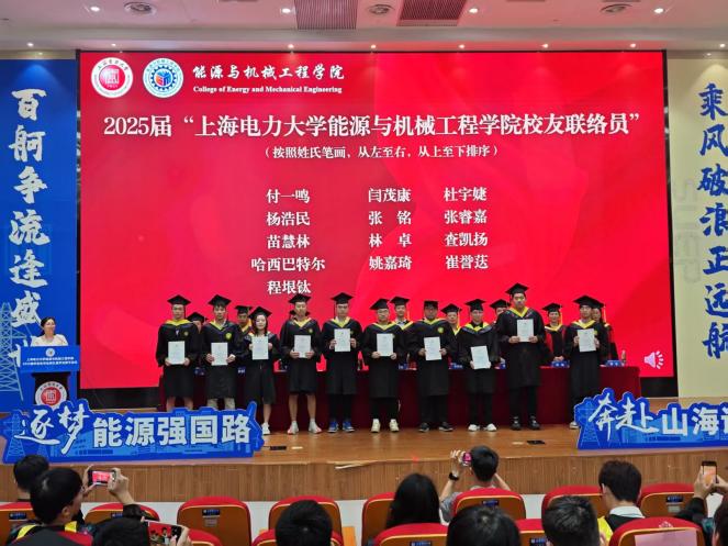 毕业典礼为毕业生们赋予了“校友”的新身份。任洪波宣读了《2025届“上海电力大学能源与机械工程学院校友联络员”名单》,13名校友联络员上台受聘,肩负起校友和学校紧密联系的重任。