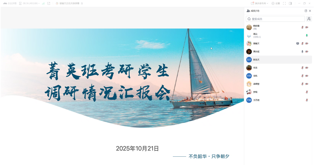 为帮助能源与动力工程专业学生更科学地规划未来,2023级校友职业成长导师、浙江浙能电力股份公司人力资源部副主任鲁传龙为所联系班级布置了一项为期两个月的考研调研任务,旨在引导学生通过数据分析和行业研究,明确考研动机与职业发展方向。10月21日,考研调研团通过腾讯会议举行中期检查,黄兆铤、王艺焜等同学汇报了《能源与动力专业考研动机·院校对比·职业发展调研报告》的阶段性成果,会议由辅导员高汕主持。