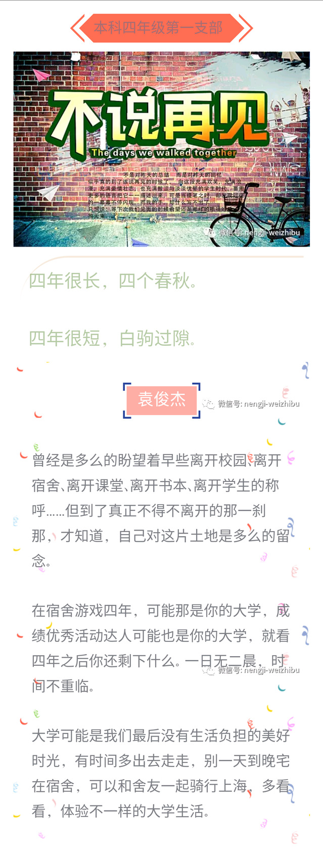 此次组织生活会主要分为两个阶段。第一阶段是向周围的同学们发送征集邀请。第二阶段就是通过“微支部”的微信平台将这些分享。我们请即将毕业的四年级学生们送给学弟学妹们一段话,其内容包含选课、考试等学习方面,生活住宿等生活方面,社团、活动等工作社交方面,以及详细的介绍了备战考研,以及择业中应该注意的事项等等。每位投稿的同学都很认真的以一个“过来人”的身份真切的把自己的想法说了出来,有的话语很诚恳,有的建议很实用。