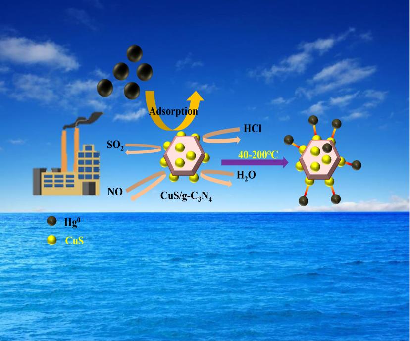 电厂烟气中含有的汞、砷等重金属作为典型的大气污染物,由于其具有毒性高、生物积累性强、在大气中可远距离传播等特点,对生态环境和人类健康造成严重危害。该ESI高被引论文通过简单的一步水热法在g-C3N4超薄纳米片上负载了CuS形成CuS/g-C3N4复合材料。得益于g-C3N4较大的比表面积以及CuS与g-C3N4之间紧密接触产生的莫特-肖特基效应,增强了界面电荷转移,强化了复合物对单质汞的氧化过程,同时铜离子与多硫化合物的协同作用也可以有效促进去除Hg0。这项研究为烟气净化及金属硫化物改性氮化碳基催化剂提供了新的探索方向。