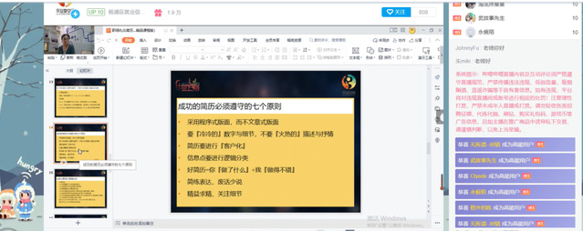为切实提升学生就业能力和职场竞争力,帮助学生实现更高质量就业,能源与机械工程学院于2022年9月13日通过Bilibili直播间组织开展主题为“简历在手,职达未来”的线上简历制作技巧专题讲座,讲座由杨浦区就业促进中心专家陈燕进行讲授,2019级学生进入直播间观看交流。