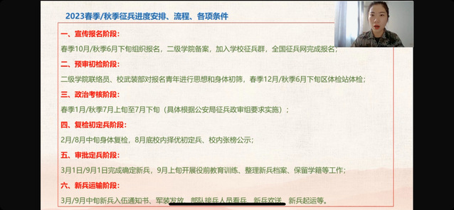 随后,仝晶晶从教育部、上海市、学校三方面介绍了征兵的法律依据和相关政策。依照法律服兵役和参加民兵组织是中华人民共和国公民的光荣义务,一切国家机关和武装力量、各政党和各人民团体、企业事业组织、社会组织和其他组织,都应当支持和依法参与国防建设,履行国防职责,完成国防任务。从高校应征入伍,为同学们未来的成长成才提供了更多的方向和选择。对于即将开展的2023年春季征兵工作,会上也将各个重要的时间节点进行了详细说明,鼓励有意愿的同学提前做好准备。