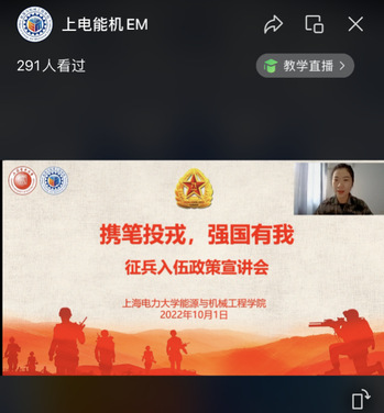 10月1日,能源与机械工程学院依托学院微信视频号“上电能机EM”以“携笔投戎,强国有我”为主题进行直播互动。学院征兵工作负责人仝晶晶主讲,邀请了学校优秀退役大学生士兵进行分享。仝晶晶从教育部、上海市、学校三方面介绍了征兵的法律依据和相关政策,详细讲述了高校应征入伍的相关流程,明晰了各个重要时间节点,为同学们未来的成长成才提供了更多的方向和选择。来自经济与管理学院的李昱璋、能源与机械工程学院的刘仕祥和电气工程学院的康洁轩分别为大家介绍了自己的军旅生活。“强国必须强军,军强才能国安”,征兵宣讲增强了广大新生的国防意识和国防精神,并激发了青年学生应征入伍的热情。