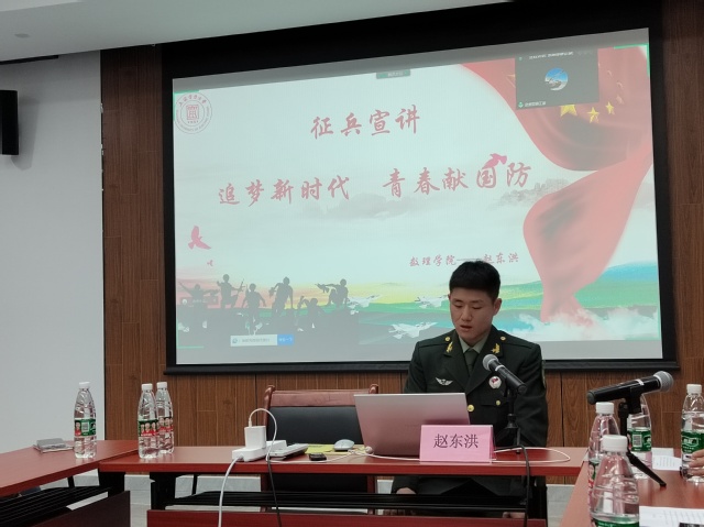 首先,薛正豪老师从国家政策法规方面介绍了征兵入伍的重要意义,依照法律服兵役和参加民兵组织是中华人民共和国公民的光荣义务。我校历年都十分重视征兵工作,十五年来已为部队输送超过800余人次的优秀大学生兵源,其中诸多学子已成长为优秀的军士或者军官,扎根基层,报效祖国,建功立业。