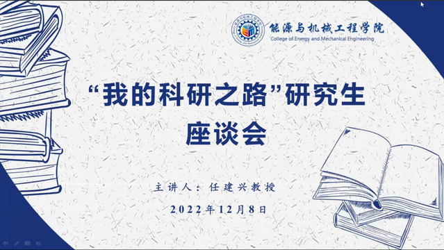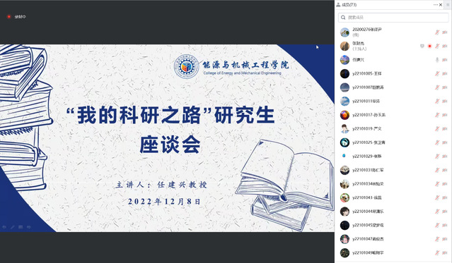 帮助2022级研究生新生尽快融入校园,更好地适应研究生生活2022年12月8日下午,在关工委老同志的关心指导下,能源与机械工程学院“我的科研之路”为主题召开了研究生线上座谈会。活动邀请学院关工委老同志任建兴教授作为主讲嘉宾2022研究生新生代表70余人参会会议由关工委专项工作负责人张财亮主持。