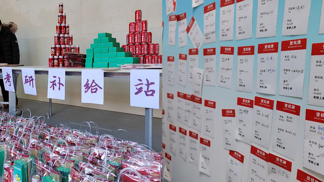 老师们精心设计制作的考研“加油包”里不仅有学习必备的文具套装,还有牛奶、暖宝宝、可乐、定胜糕等物品,分别寓意着“牛气冲天”、“暖心相随”、“动力满满”、“百战百胜”,为考研学子加油助力,考研学生在做好个人防护的前提下分批次前往领取。