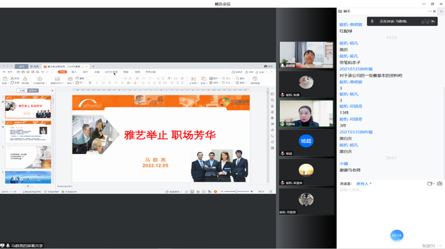 为加强同学们就业技能技巧,提高就业竞争力,为步入职场、步入社会打下良好基础,能机学院于2022年12月5日晚19:00在线上开展了主题为“专家同行 聚力暖冬—雅艺举止、职场芳华”的职场礼仪培训讲座。本次讲座邀请了高级人力资源管理师马群燕作为主讲人,为同学们悉心讲解了礼仪与习惯,气质和仪态,会面与商务,沟通与谈吐。