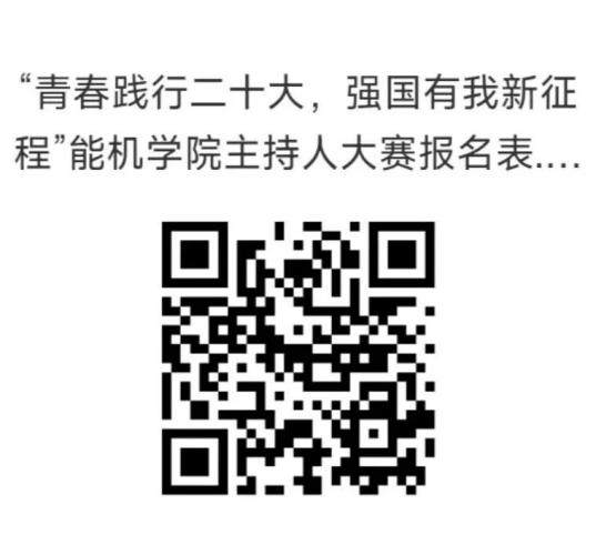 报名方式:选手需统一填写电子版《“青春践行二十大,强国有我新征程”能机学院主持人大赛报名表》,报名表以“姓名+学号+报名表”格式命名,发送至文艺部邮箱:1613028123@qq.com,报名截止至4月2日晚20:00。同时用QQ扫描下方二维码进群:加群请注明班级、姓名、学号,决赛前会有相应培训。