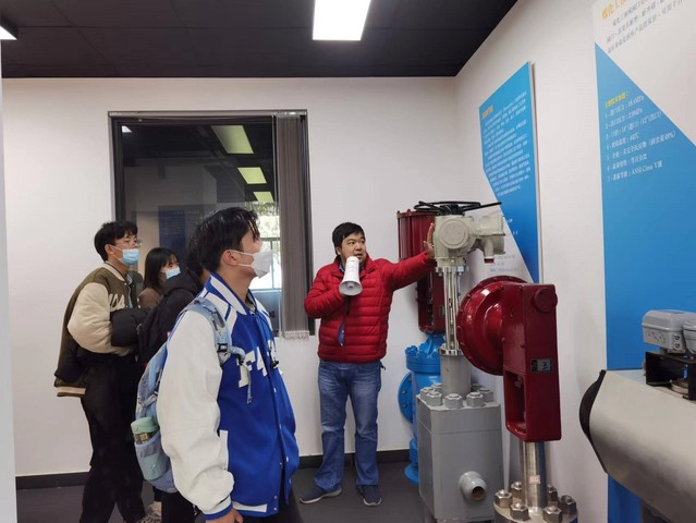 上海自仪技术园区党总支副书记沙璟琰、技术中心智能仪表研究室主任王鑫热情接待了能机学院师生,并对公司的基本情况进行了简要介绍。随后,沙书记、王主任带领师生来到公司的对外展览馆,在两位领导的带领与讲解下,师生们见证了公司从创立之初到现在的发展历程和辉煌成就。一代代产品记载了上海自仪在不同时代的变革和飞跃,记录着每个时代自仪人不懈努力的劳动成果。在参观中,王主任还为同学们普及了安全生产管理的“四个凡事”、“一次把事情做好”等职业精神,对同学们的处事准则与工作习惯形成了良好熏陶。