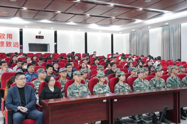 周婷在致词中表示非常有幸请到“南京路上好八连”来到学校与大家分享“霓虹灯下的哨兵”的故事,希望大家能在分享中感悟到好八连跨越时代的精神魅力、坚守理想的精神伟力、艰苦奋斗的优良传统、规范严明的纪律作风,常怀报国之志,让青春在祖国最需要的地方绽放绚丽之花。同时感谢校武装部薛正豪老师和退伍学生代表的参加,能为大家带来最新的征兵入伍政策和要求,分享最生动的部队生活和军营感悟。