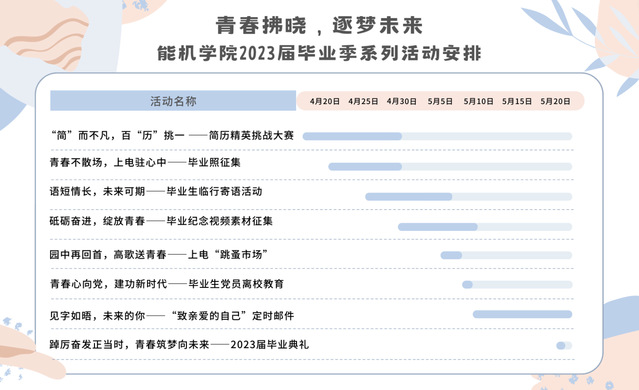 恍然间,四年的时光苒苒而过,2023届能机学子也迎来了属于自己的毕业季。在大四学子们启程之际,学院筹备了“青春拂晓,逐梦未来”毕业季系列活动,希望能给你们留下一个美好的回忆,感受到母校的温暖和关怀。