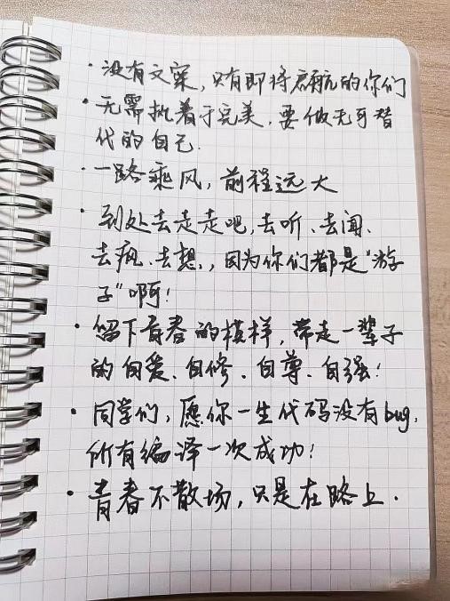 夏风带走的只有那遮不住的热意,带不走我们之间数不清的回忆。那就好好告个别吧,和课桌、黑板、操场、食堂,和吹过教室走廊最后那一阵风,和某一段回不去的青春。时光阴荏苒,我想你一定对四年的时光感慨万分,让我们将此以文字的形式记录,珍藏这段美好的回忆。语短情长,寄语作为传承的同时,鼓励能机学院“后浪”,珍惜宝贵的大学时光,不负韶华、勤奋学习、快乐生活,同时感怀青春、留念岁月。