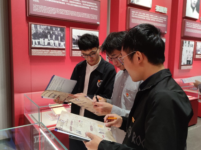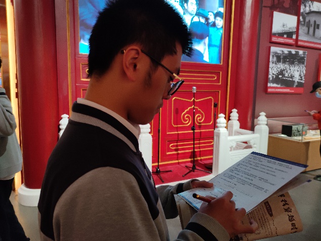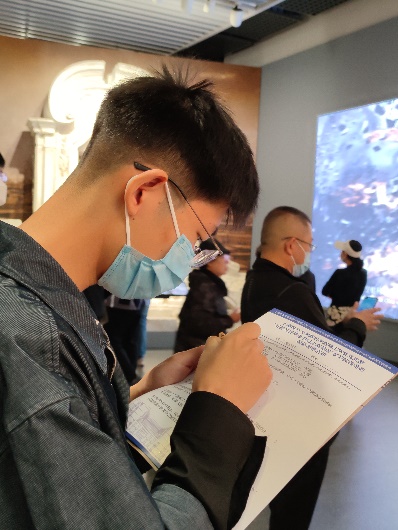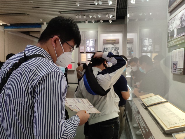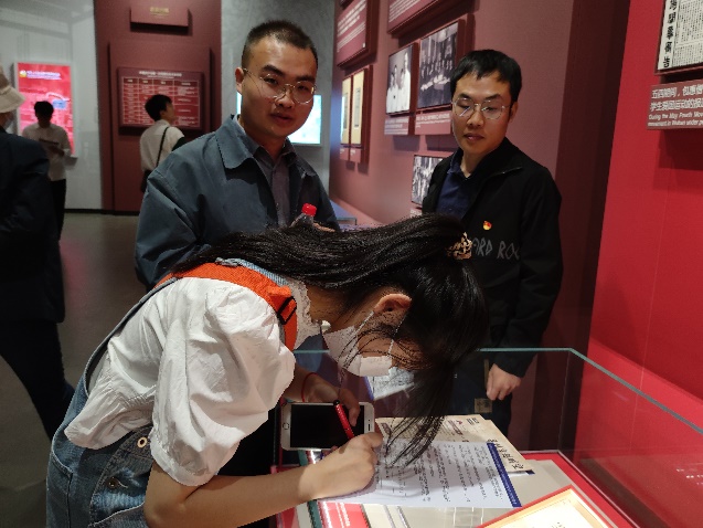 此次实地研学活动创新采取沉浸式互动学习方式,设置了合影打卡任务点、收集路人感言打卡任务、现场参观答题。党员同志们边参观边找答案,并通过小组讨论,认真作答。