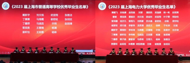 朱群志宣读了《2023届“上海市普通高等学校优秀毕业生”名单》、仇中柱宣读《2023届“上海电力大学优秀毕业生”名单》。2023年学院共有61位同学获得“上海电力大学优秀毕业生”荣誉称号,其中18位同学被推荐为2023年“上海市普通高等学校优秀毕业生”。学院领导和导师们为优秀毕业生颁发证书,并鼓励获奖毕业生珍惜荣誉、再接再厉。