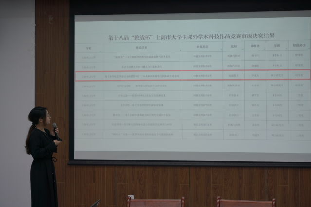 成勇宣读2022年度获“康迪纳-东楼奖学金”支持的科创项目团队名单,并与于磊先生一起为获奖团队代表颁奖。荣获第十八届挑战杯上海市大学生课外学术科技作品竞赛特等奖的科创项目团队进行了现场展示分享,为同学们树立了热爱科创、投身科创的榜样。