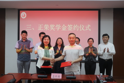 捐赠仪式中,施正荣院士向学校教育发展基金会捐赠一百万元并设立“正荣奖学金”。丛亮与施正荣院士签订协议,张川为施正荣院士颁发捐赠证书,现场领导、老师以及学生共同见证。