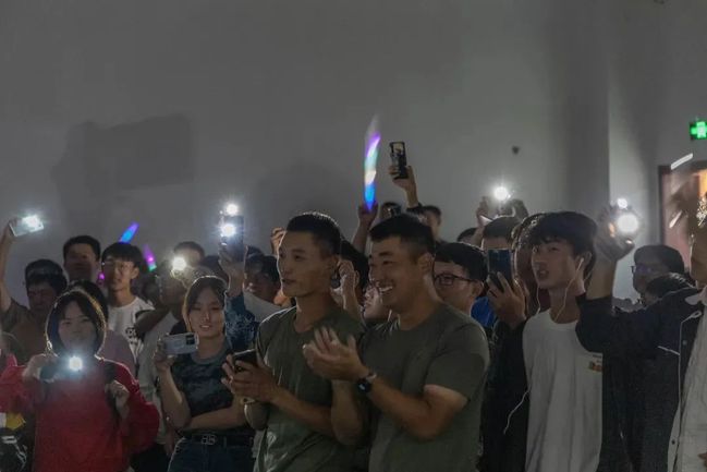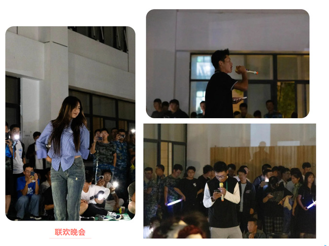 晚会过半,各连教官提着带有连队口号的蛋糕,在全场热烈的欢呼下进入会场。他们将自己真挚的祝福传达给每一位新生——心怀梦想报效国家。随后全体教官带领同学们集体合唱《最炫民族风》,将会场气氛推向高潮。在教官们与同学们的阵阵歌声中,大家一同切开蛋糕,点燃蜡烛,彼此留下美好的祝福。晚会最后,全体师生与教官合拍集体照,此刻,定格军训的苦乐回忆,传递真挚的“师生”感情。
