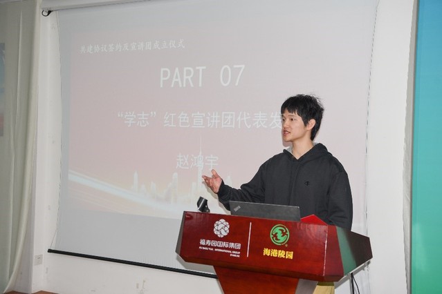 “学志”红色宣讲团团长赵鸿宇代表成员进行发言,表示宣讲团将以增强家国情怀意识、传承光荣革命传统、培养学生社会责任感为目标要求,努力帮助学生学习红色文化及其精神内涵,弘扬社会正能量,引导学生树立正确的世界观、人生观、价值观,做有理想、敢担当、能吃苦、肯奋斗的新时代好青年。