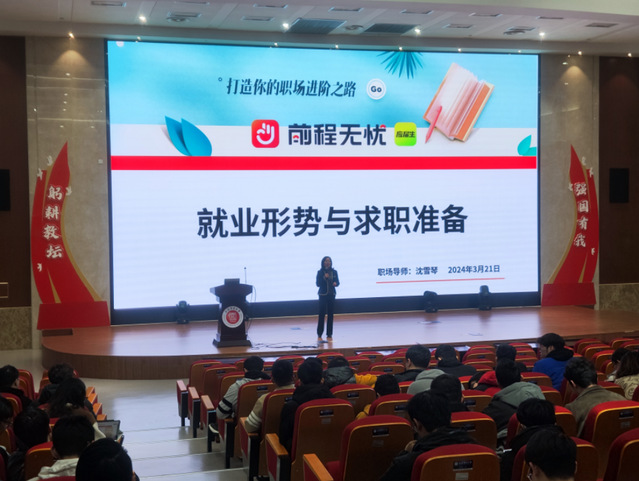 为引导学生树立正确的就业观和职业观,做好职业生涯规划,明确求职方向。3月21日,能源与机械工程学院组织开展了“走近职场”系列活动之《大学生就业与创业实务》课程解读专题会暨《就业形势分析与求职准备》讲座,邀请前程无忧职场导师沈雪琴开展讲座,2021级辅导员赵玉伟、2021级全体本科生以及2024届毕业生300余名学生参会,会议由辅导员高汕主持。