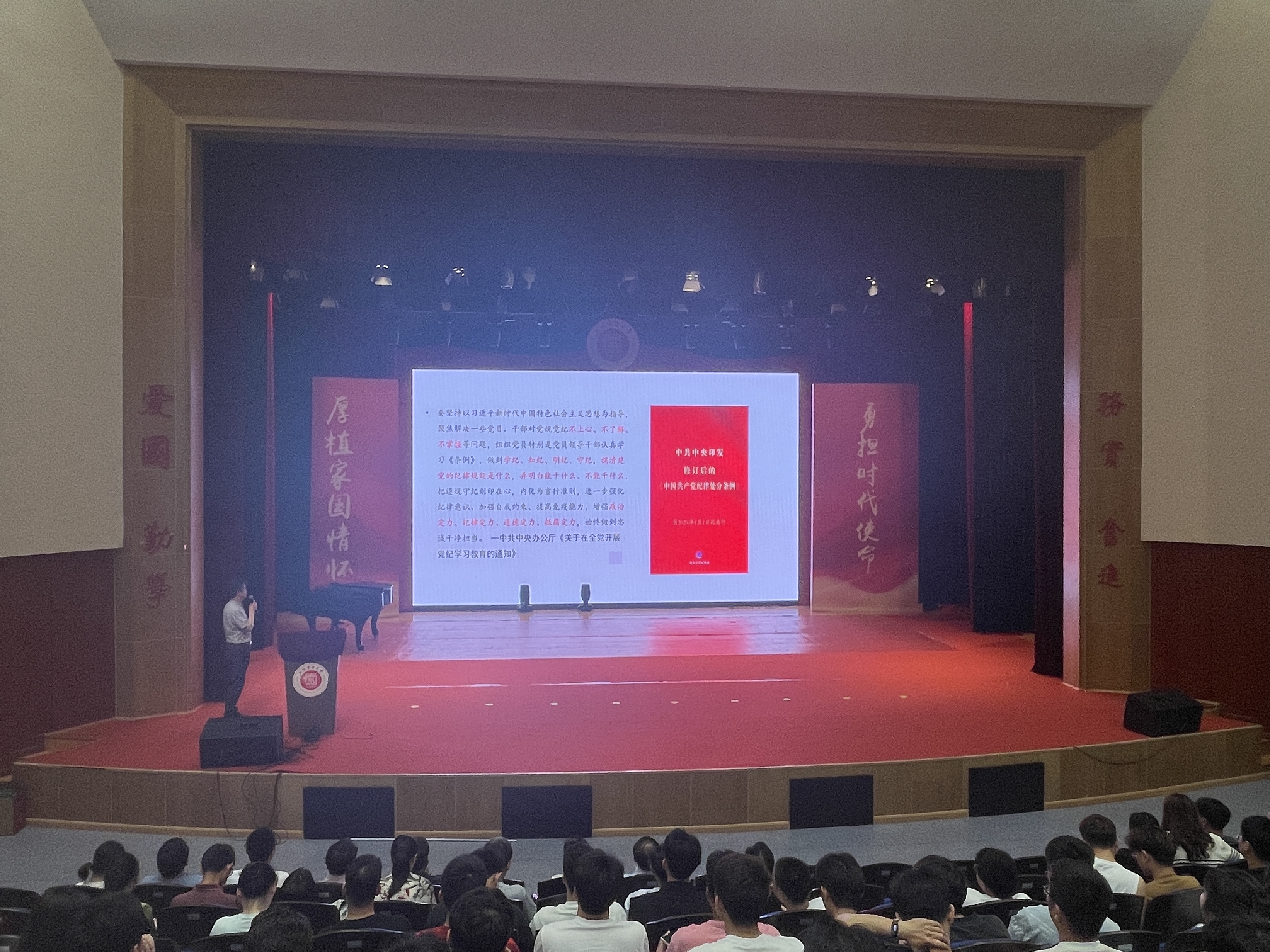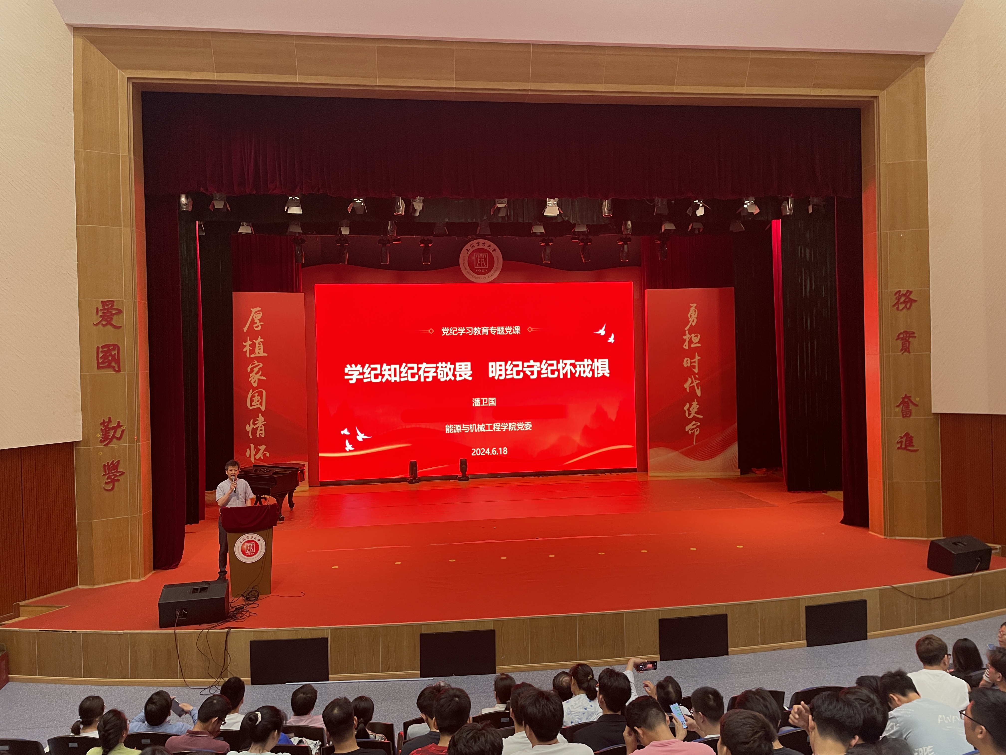 6月18日,能机学院党委书记潘卫国以“学纪知纪存敬畏 明纪守纪怀戒惧”为主题,讲授党纪学习教育专题党课,能机学院全体师生党员参加学习。
