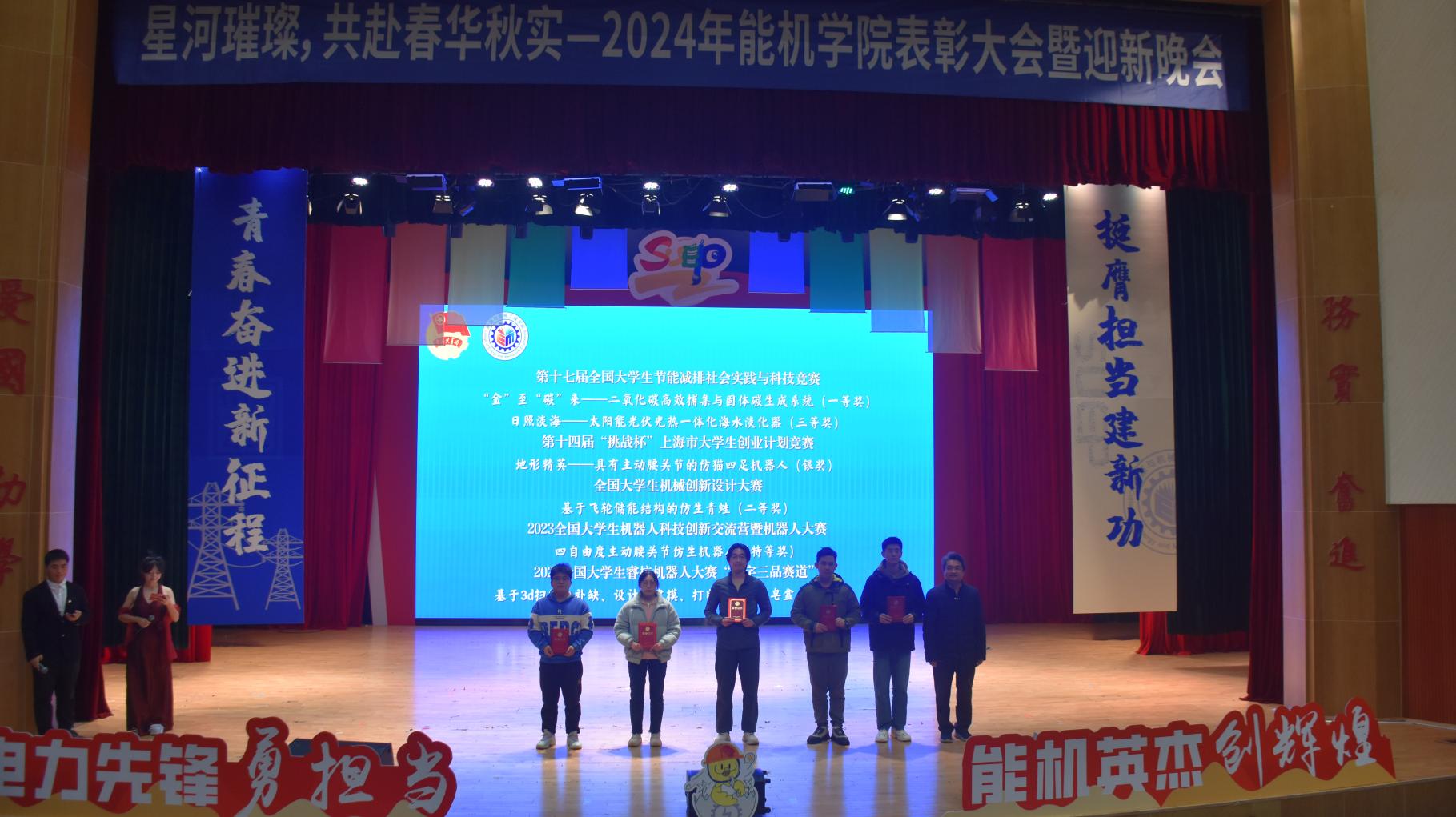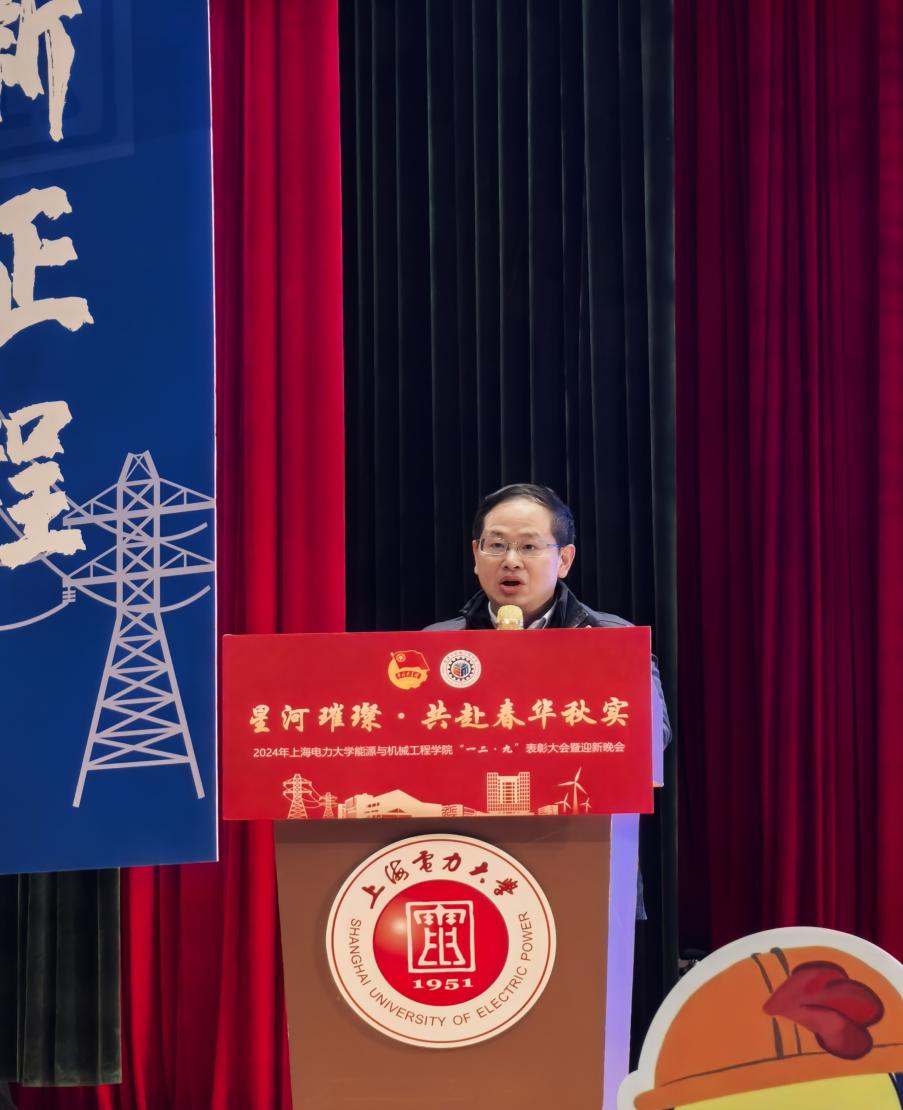 2024年12月13日下午13:30,能源与机械工程学院“星河璀璨,共赴春华秋实”一二·九表彰大会暨迎新晚会在上海电力大学临港校区大学生活动中心演艺厅隆重举行。能机学院院长朱群志、党委副书记周婷、副院长仇中柱、副院长陈乃超、团委书记韩林岑、全体辅导员以及学生代表出席。
