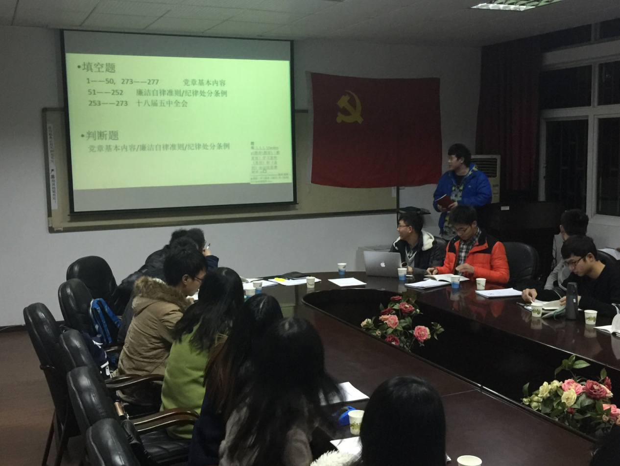 本科2013级党支部于2015年12月16日在学院206会议室集中学习了党内三大法规,年级辅导员袁智老师参加了支部学习,集中学习之后,采用了轮流随机选题的竞猜形式考核大家对三大重要文件的学习效果。这种互相学习的方式极大激发了同学们的学习激情,充分调动了同学们的积极性,现场气氛非常活跃,受到同学们的一致认可和高度评价——“跟我原来想的学习方式不一样、出乎意料,虽然学习了近四个小时,但是依然觉得趣味性很强,效果还挺好的,希望党支部多采取这样的形式。”