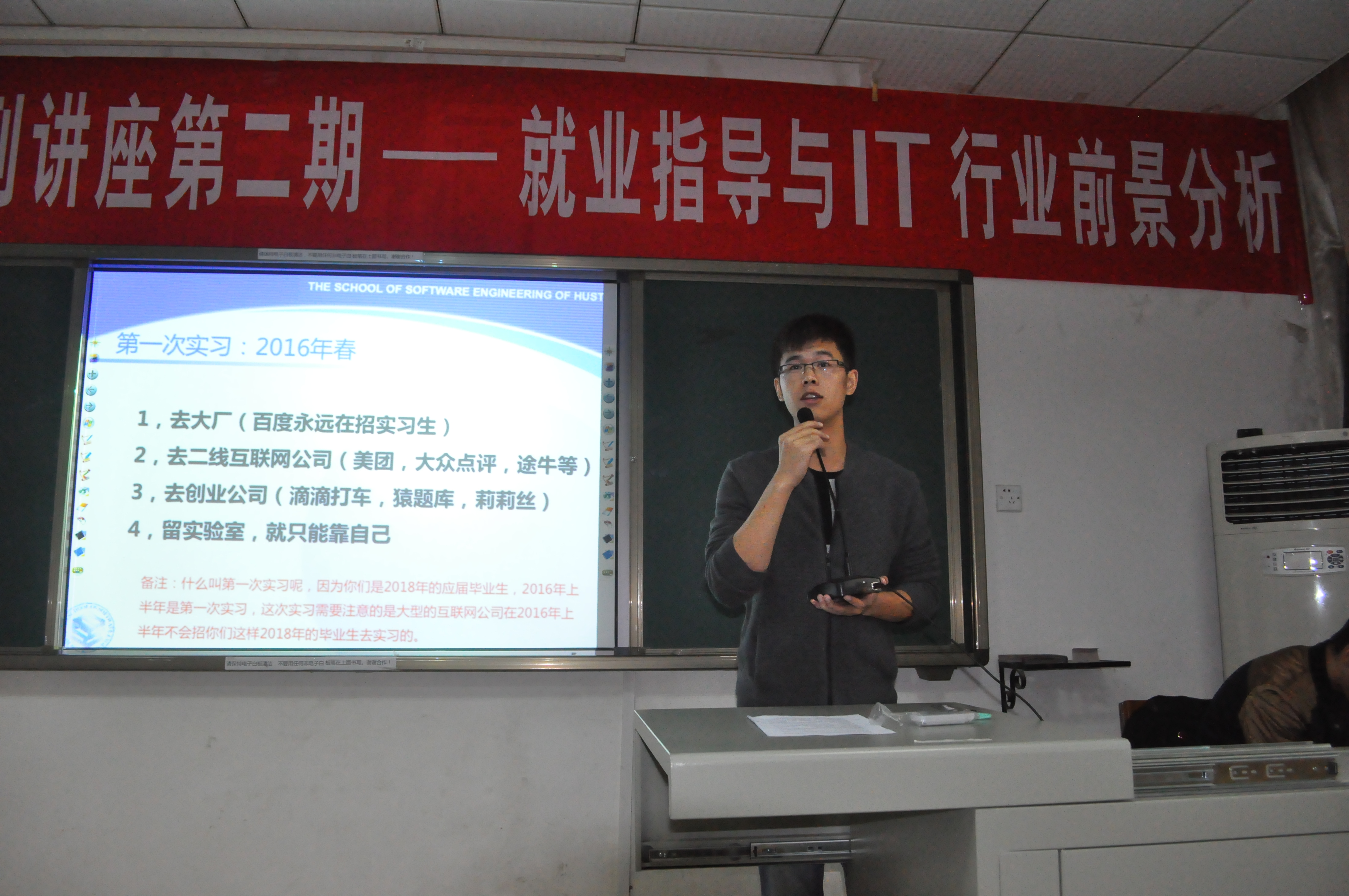 接下来,杨娟学姐就“论如何优雅的做一名程序猿”开展了交流,讲述了自己作为女生是如何学习IT技术的以及求职的感触,她提到“尽管IT行业中男性居于多数,但也因此给女性带来很大的机会,我们女生应该充分发挥自己的优势,努力发展自己的技能,不妄自菲薄,巾帼不让须眉”,使得台下的女同学都纷纷称赞。栾玖阳学长交流的主题则是“虽然我不是大牛,但我有一颗做技术的心”,他表示在校期间自己投入了很多精力在学生工作上,以致于专业技能并没有那么优秀,但是通过实习逐渐抓回专业知识,而学生工作又在无形之中让自己更适应工作,因此他也建议学生干部努力从学生工作中获得经验,同时也不要放松学习。晏宇学长则讲了自己“实习中的心得体会”,他则建议同学们好好利用研一的时间,充分学习专业知识,提升相关技能。演讲完毕后,同学们踊跃提问,例如有人问到“国企和外企哪个比较好”的问题,这些前辈们都一一耐心的进行了解答,讲述了自己的经验,时间总是很快,最后学长学姐留下了自己的联系方式,方便与同学们进一步交流。