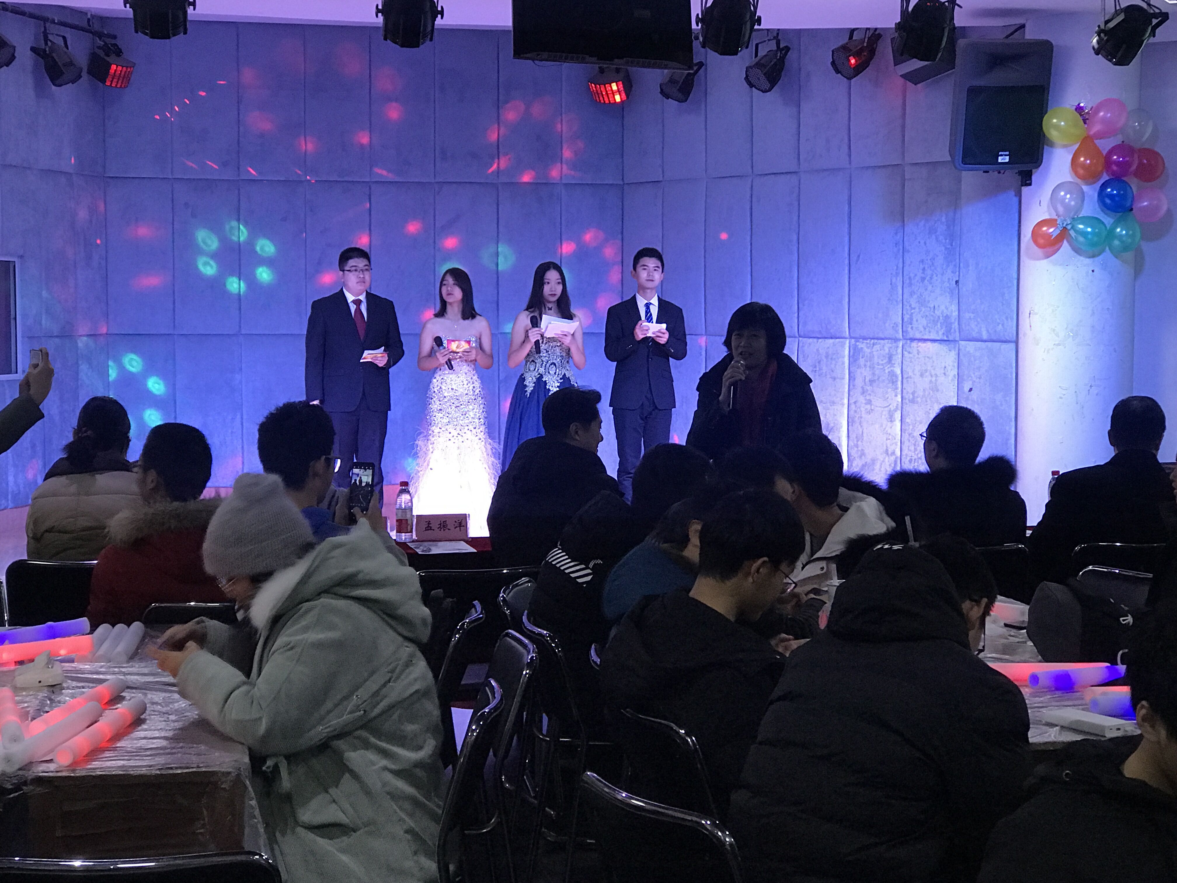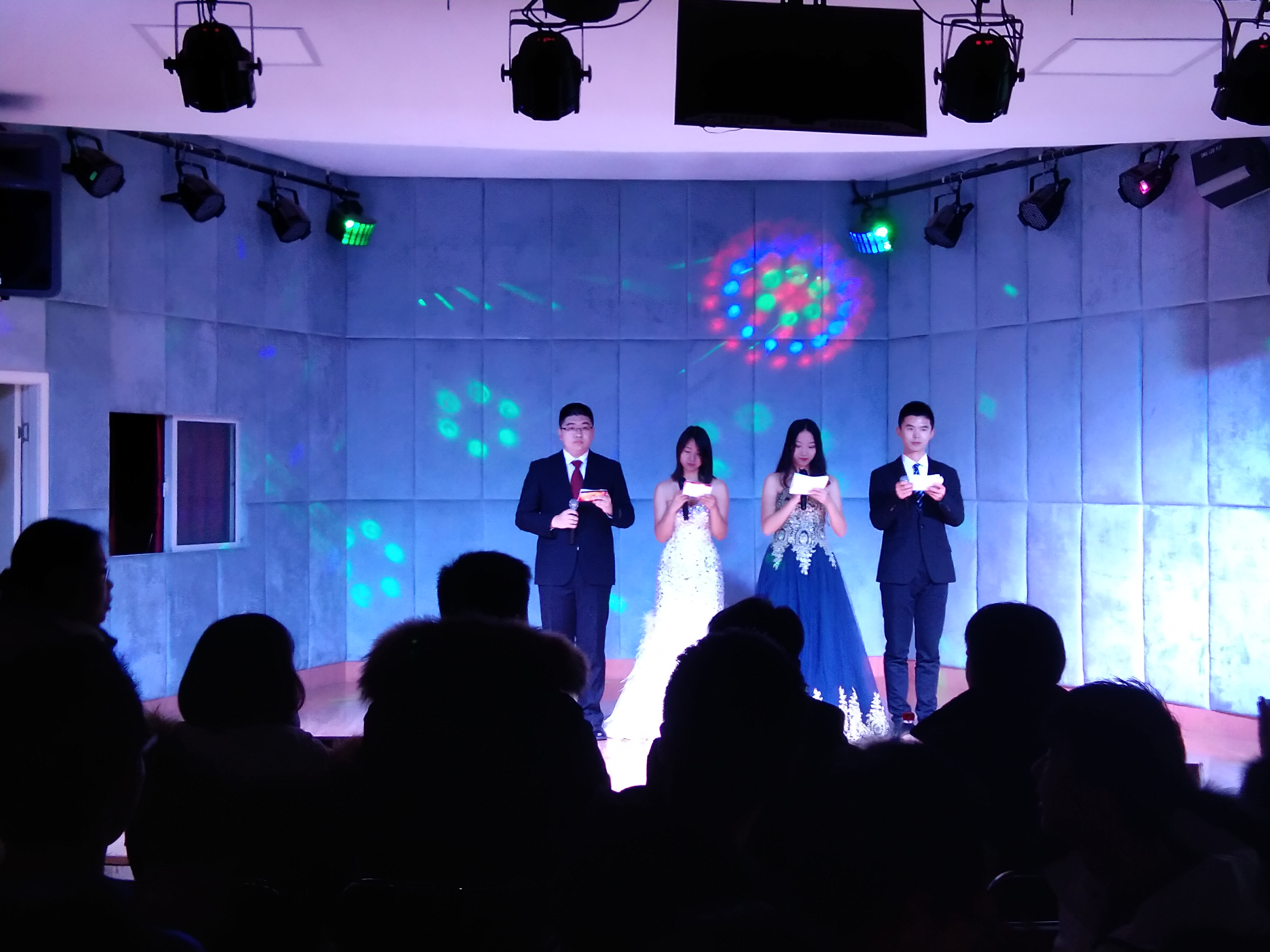 晚会开始,学院党委书记徐进老师发表了讲话,她讲到:“今天来到晚会的现场,看到同学们朝气蓬勃的精神风貌感到十分高兴,考试周同学们很忙,希望大家能够缓一缓脚步,享受今晚的演出,祝大家玩的开心尽兴!”