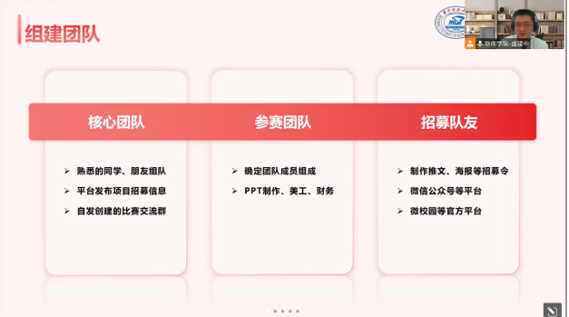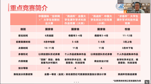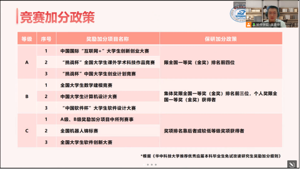 在宣讲会中,盛建中博士对推免竞赛加分政策进行了解读,为想要准备推免的同学在创新创业竞赛的准备方面送上了自己的建议。