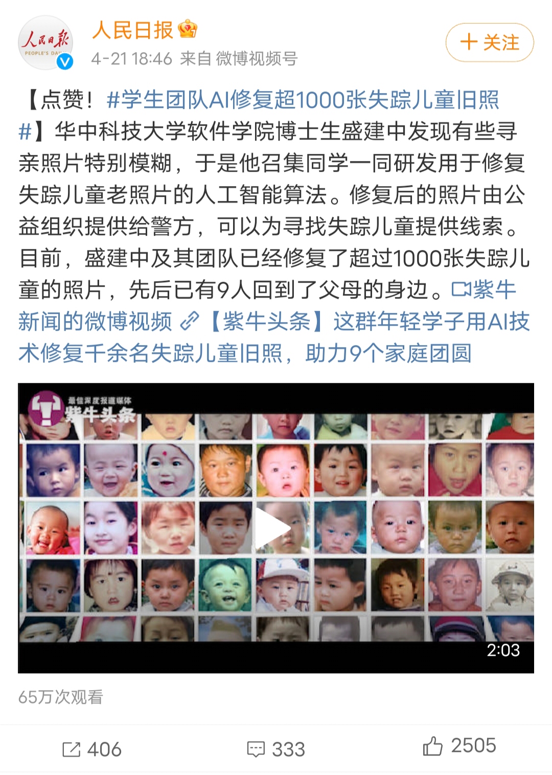 除了修复失踪儿童的照片,团队还将AI修复技术应用到了更多方面。2021年清明前,退役军人事务部启动了“为烈士寻亲”的活动。团队利用AI算法成功修复多幅照片,再还原到海报中。之后,他们将这些修复过的烈士照片和身份信息以及向官方提供寻亲线索的方式发布在团队的账号和网页上。团队还尝试修复了钱学森、袁隆平、张桂梅等功勋科学家和模范人物年轻时的黑白照片,并利用AI技术对照片中的人物进行动态化处理,制作成短视频。致敬英雄,他们让英雄的样貌也能够被清晰地铭记。