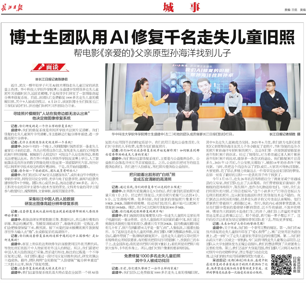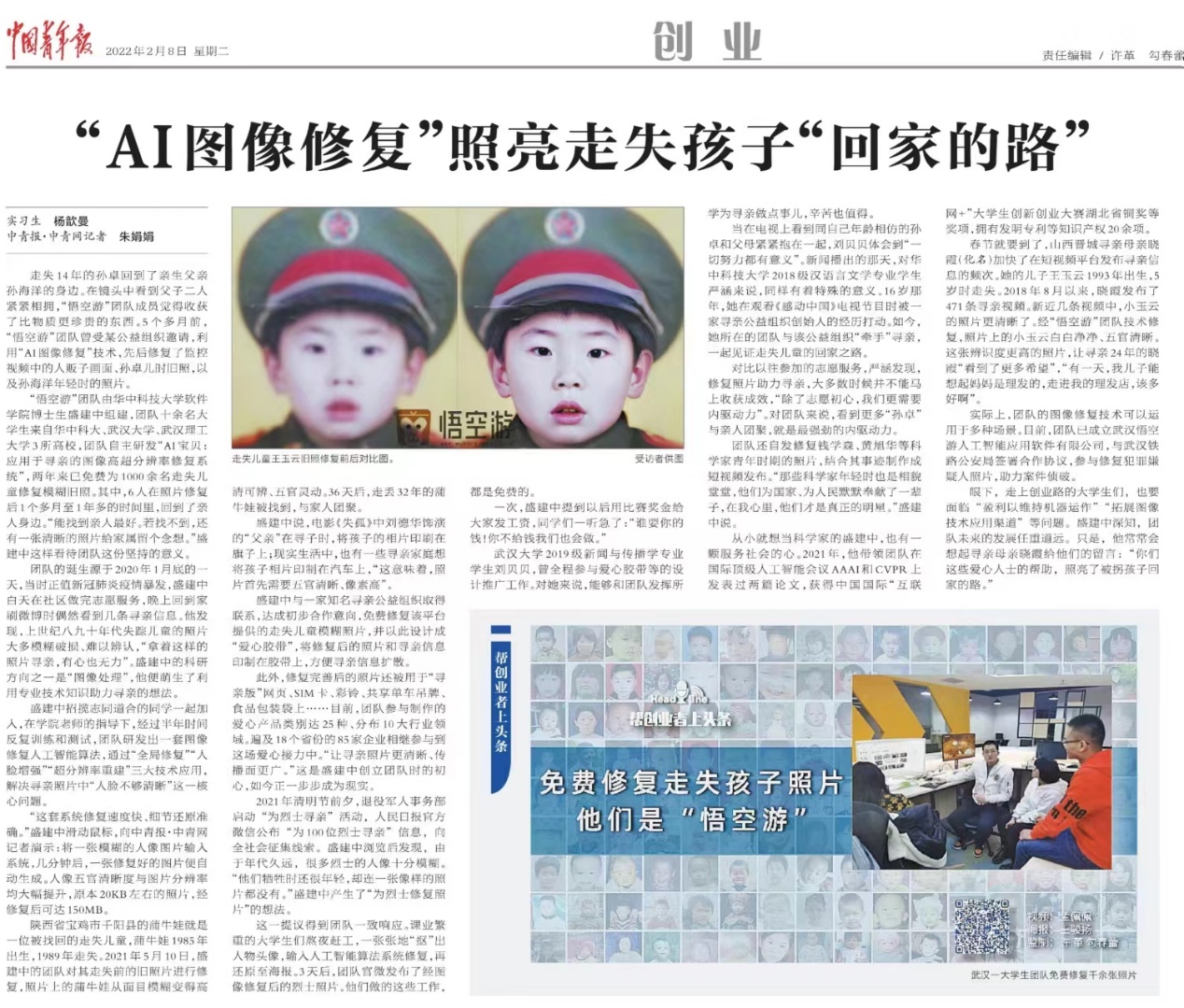 至今,团队已经帮助修复了1000多名失踪儿童的照片,助力9名失踪儿童成功寻回。未来,他们将坚守初心,继续坚持科技创新与社会公益的结合互促,“科技赋能寻亲,创新培养人才”,擦亮华中大的名牌,为社会注入一分华中大青年力量,为时代交上一份华中大青年答卷。