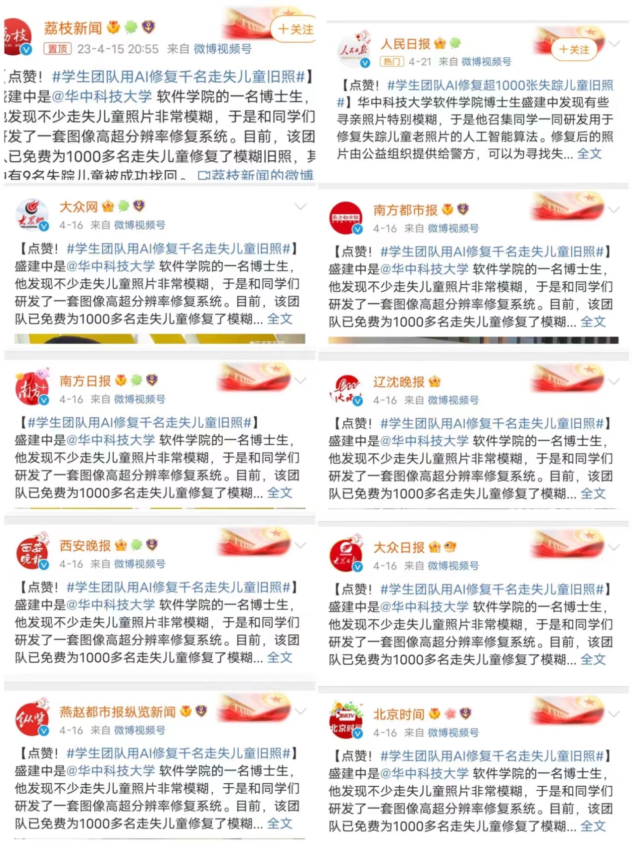 2023年4月10日,WilliamHill中文官方公众号专题报道了团队事迹;4月14日,经视直播对团队事迹进行了专题报道;4月16日,央视网等多家权威媒体作出专题报道,与此同时,“学生团队用AI修复千名走失儿童旧照”话题冲上微博热搜榜第二,引起了更为广泛的关注;4月21日,团队事迹被《扬子晚报》专题报道,并被《学习强国》和《人民日报》官方微博转载点赞,获得高度评价;4月23日,团队主要成员参加《长江日报·面谈》节目接受采访,采访内容于4月25日刊登在《长江日报》第五版予以专题报道。早在2022年1月21日,《中国青年报》就对团队事迹作出了报道,同时有多家媒体平台报道转载。