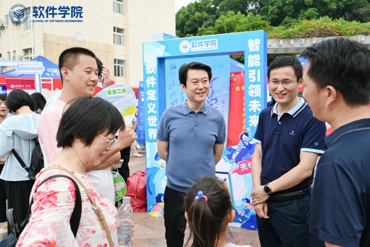 瞬间六:院领导来到迎新点,关心新生报到情况,与新生热情互动。