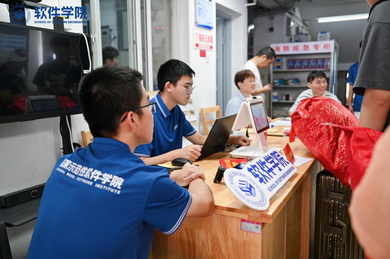 瞬间八:学生宿舍内,志愿者引导同学办理入住手续,进行人脸核验。