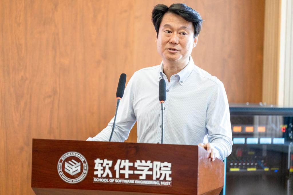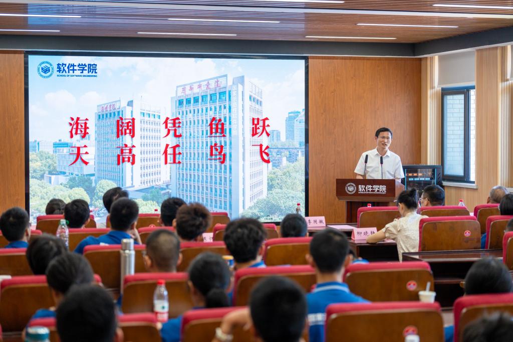 随后,学院副院长沈刚教授向新生主讲“开学第一课”。沈院长援引左宗棠的对联,向同学们提出了“择高处立,就平处坐,向宽处行”的要求。同时引用梅宏院士“软件定义一切”“万物皆可互联”“一切皆可编程”的观点,鼓励大家树立信心,奋发有为,学习软件工程这一专业可以“大有可为”。随后沈院长介绍了软件工程这一专业的重要意义、培养目标、培养特色、课程体系和未来前景,让新同学们对软件工程有了更深入的认知,对未来学习有了更明确的规划。