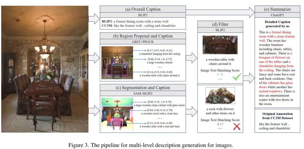 主要分为五个步骤:第一步,使用BLIP2对整张图生成全局描述;第二步用 GRIT生成区域框,并提供区域中对象的名称和详细描述,同时使用PPOCR提取区域的文本框坐标和文本内容;第三步使用SAM进行分割,并送入BLIP2生成对各个物体及其组成部分的详细描述;第四步使用BLIP-2 评估过滤掉低分匹配;最后使用ChatGPT 对上述得到的描述进行总结从而得到图像的详细描述。