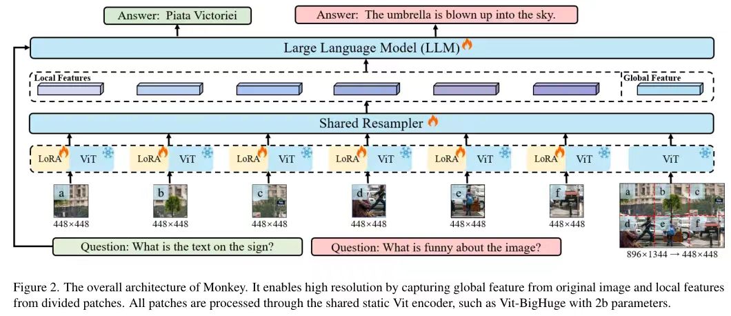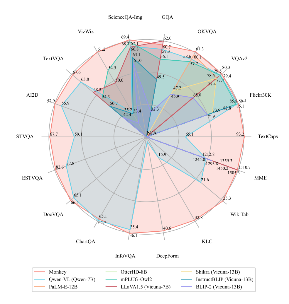 通过专注于大分辨率,Monkey能够处理分辨率高达1344x896的图像。Monkey在大规模带有详细描述的高质量图文数据上进行了训练,帮助其炼就洞察图像细节的火眼金睛,取得了与Caption和QA任务相关的16个数据集的SOTA,甚至与GPT4V相比,在密集文本问答任务上也有着亮眼的表现。
