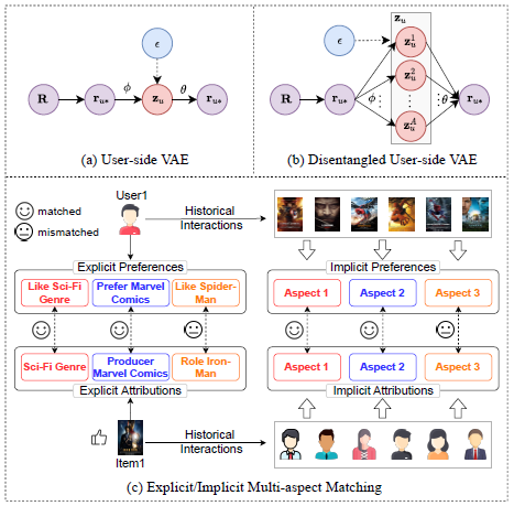 论文主要聚焦于解决隐式多样偏好匹配问题,指出现有的协同推荐方法通常学习用户和物品的耦合表征,难以建模它们之间多样的匹配关系。然而,在隐式推荐场景下实现用户和物品的多关系匹配面临两个挑战:(1)如何基于隐式二元交互数据推断用户和物品解耦的多方面表示;(2)用户和物品解耦表征的独立性和匹配错位问题。