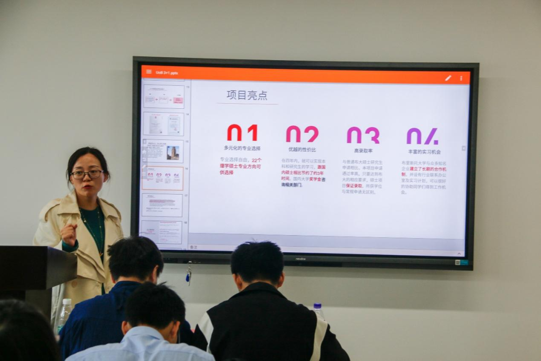 分享交流会上,戴淑琼老师为同学们详细介绍了学校的国际交流项目,并重点讲解了N+N项目及其独特优势。通过此项目,学生可以提前锁定合作学校而避免后期繁琐的申请流程,并将有机会获得两个不同学校的学位。此外,第五年开放的特殊设置,为学生提供了更为灵活的学习安排,让他们能够在国内外优质教育资源之间自由切换。此外,戴淑琼老师还介绍了欧美和亚洲地区的热门交流项目,为学生申请留学提供了多样化的选择。