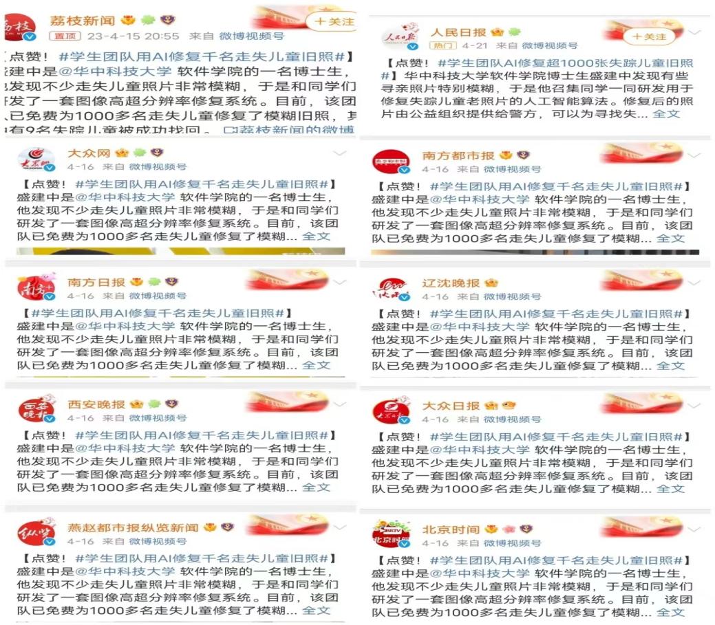 2020年3月,盛建中发起成立AI宝贝志愿服务队。团队开创性地将图像修复技术应用到了寻亲当中,研发出“AI宝贝:应用于寻亲的图像高超分辨率系统”,有效解决了寻亲中“人脸不够清晰”这一核心问题。截至目前,团队已经为1000余名失踪儿童修复照片,借助图像修复技术,16名失踪儿童被成功找回。