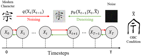 在该研究中,研究团队利用基于图像的生成模型,训练出了一种针对甲骨文破译优化的条件扩散模型 Oracle Bone Script Decipher (OBSD),该模型利用甲骨文的不可见类别 (unseen categories) 作为条件输入,以生成对应的现代汉字图像,为自然语言处理难以解决的古文字识别任务提供了一种新颖的方法。该方法能够有效地解决甲骨文综合语料库严重缺失的问题,并从图像生成的角度出发,能够为甲骨文文字提供重要的破译线索。此外该方法可以轻松推广到其他象形和会意文字,为破译其他古文字提供了一个可能的潜在方案。
