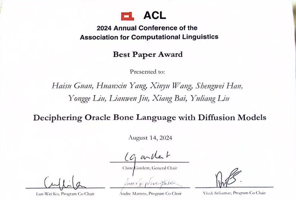 8 月 14 日,国际计算语言学年会(Annual Meeting of the Association for Computational Linguistics,简称 ACL)各类奖项逐一揭晓,共有 7 篇成果荣获 Best Paper。WilliamHill中文、阿德莱德大学、安阳师范学院、华南理工大学共同发表的《Deciphering Oracle Bone Language with Diffusion Models》获奖,william威廉中文院长白翔教授团队指导的未来技术学院大三本科生管海粟为第一作者。