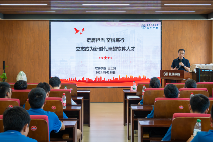学院党委书记王士贤以《挺膺担当,奋楫笃行,立志成为新时代卓越软件人才》为题,为同学们作新生入学教育。