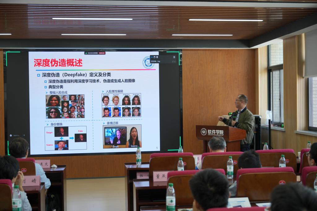 谢洪涛教授作了《深度伪造的主动防御与被动检测技术》的报告。谢洪涛教授首先介绍了深度伪造技术的基本原理和应用场景,如虚假新闻生成、恶意攻击等。随后,他详细探讨了深度伪造的主动防御和被动检测技术。报告中,谢洪涛教授分享了其团队在这些领域的研究成果。
