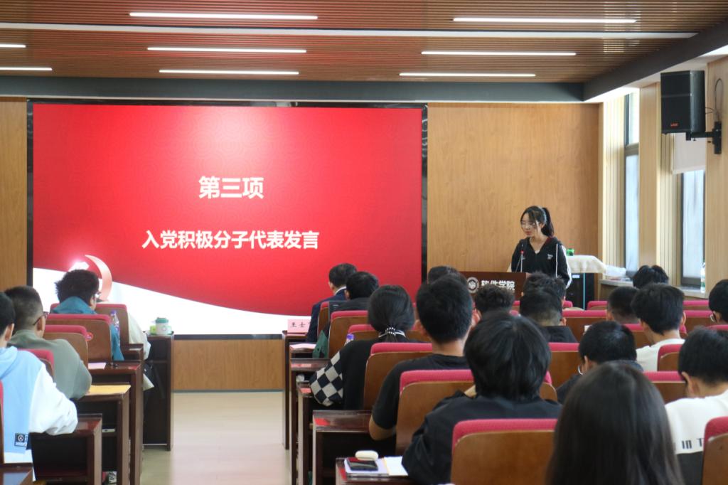软件工程2402班章烈涵代表入党积极分子表示,参加此次培训班是一次重要的成长机会,将珍惜每一堂课程,严于律己,树立服务意识,增强理想信念,以党员的标准要求自己,争取早日成为一名光荣的共产党员。软件工程2303班王烨代表发展对象郑重承诺将牢记入党初心,进一步提升思想觉悟,遵守纪律,肩负起时代赋予的责任,以党的奋斗目标为指引,将青春投入到实现中华民族伟大复兴的伟大事业中去。