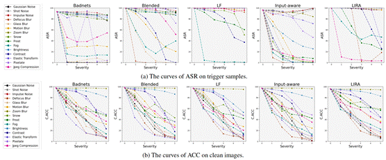 图1 (a):不同损坏严重程度下的后门攻击成功率(ASR)。(b):不同损坏严重程度下干净图像的预测准确性(ACC)。(a)中的曲线分离松散,而(b)中的大部分曲线聚集得更紧密。这表明后门感染模型对后门样本上的不同图像损坏具有不同的鲁棒性,但对干净样本上的不同图像损坏具有相似的鲁棒性。