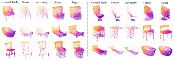 图2 PointCA生成的对抗样本。(Source是针对Ground Truth生成的局部点云。在Source中加入微小的扰动得到Adversary,其生成的Output在视觉上与Target目标样本相似。)